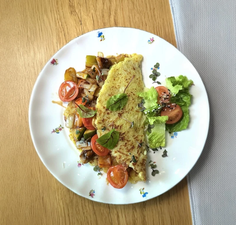Хрустящий картофельный драник, наполненный сочным овощным рагу с грибами, перцем, кабачком и томатами черри в пикантном соусе с нотами устричного и сладкого чили. Состав: картофель, лук, перец, кабачок, грибы, помидоры черри, соус устричный, соус сладкий чили.