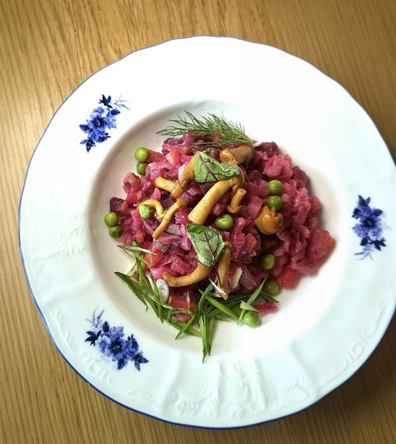 Классика вкуса с нежными маринованными грибами, отварными овощами и свежей зеленью. Состав: картофель, свекла, соленый огурец, капуста квашенная, зеленый горошек, маринованные опята, салат романо, ароматное масло, микс зелени.